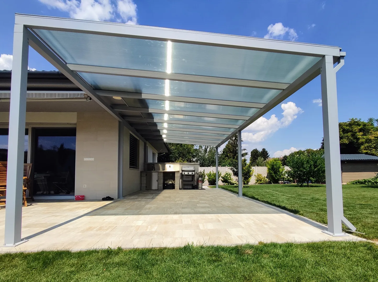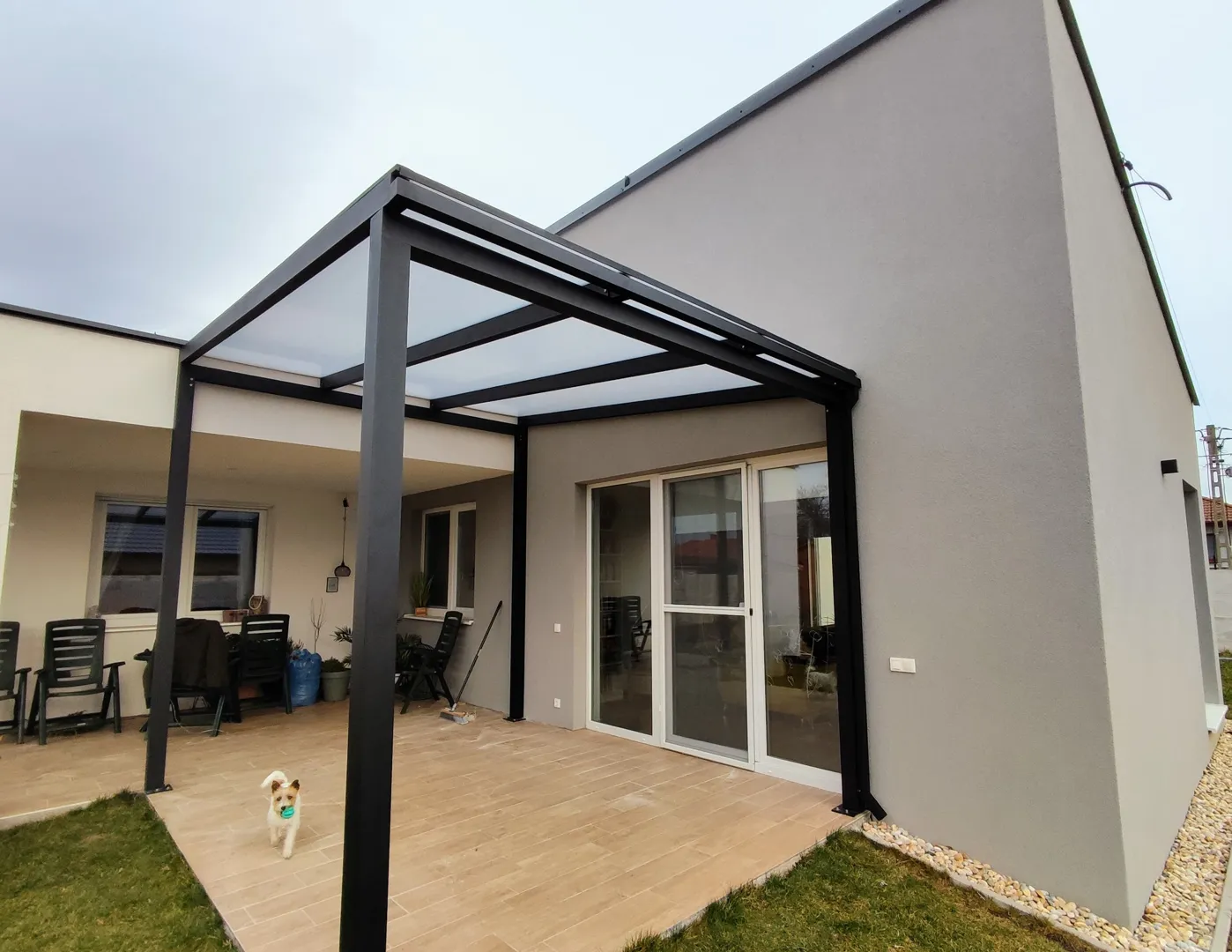 9 m²-es fém terasztető polikarbonát tetővel.