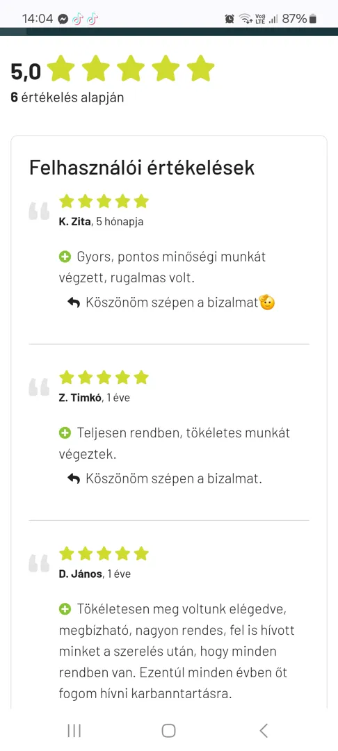 pontosan érkeztek, és az egész javítás alatt látszott a komoly szaktudás. Végig készségesen magyarázták, mi történik, a folyamatos egyeztetés miatt egy percig sem izgultam. A munka gyorsan készen lett, megbízhatóan működik azóta is, ráadásul a díj teljesen korrekt volt; ár-értékben verhetetlen