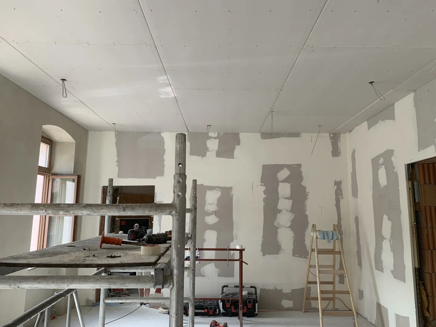 Mennyezet nem túl piszkos, összes 85m2, 2x festve mattfehérre. Oldalfalak (közlekedő, nappali, konyha,garázs) m2. Általános javítások, glettelés, csiszolás,alapozás, pasztell (halvány vaj) 2xegyszínűre lefestve. Garázs oldalfal (50m2) általános javítás, glettelés, csiszolás, alapozás és 1xszínre festés.(Eősebb szín)