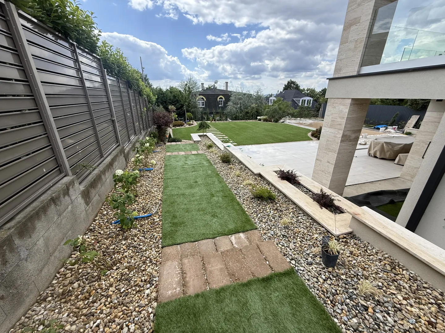 Van egy félig kész kerti, aminek a széle nincs ki kövezve és így látszik a tó fólia, azt szeretném be fejezni. Öntöző rendszert szeretnék rakatni. A tó köré 1 m-es sávban kerti tipegőt szeretnék. A földet el szeretném egyengetni. Növényeket szeretnék ültettetni körübelül darabot. Körübelül m2 a porta.
