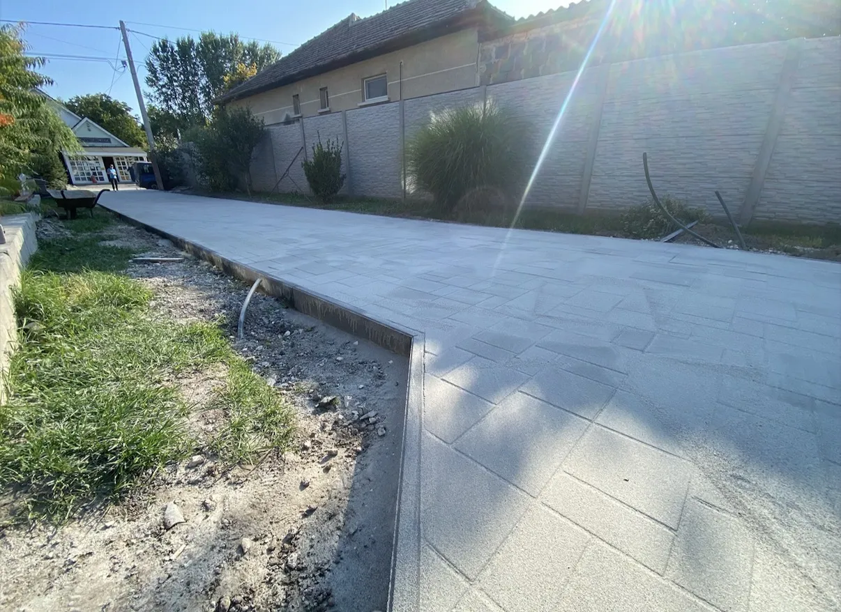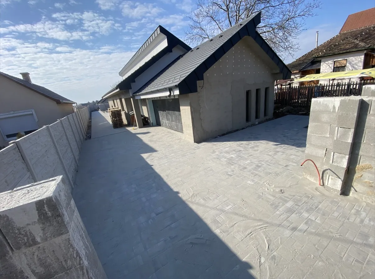 10x20cm szürke 8cm vastag L alakúan rakva. m2 2 oldalt szegelyko van, elől 10m hosszan K szegelyel csatlakozna beton úthoz. Ezt részben vágni törni kell.Hátul épület beton lábazat van xps lappal. A terület 1/3 betonos, ezt ahol csak muszaly ott törném fel a többi részen kell kialakitani ckt beton alapot
