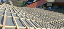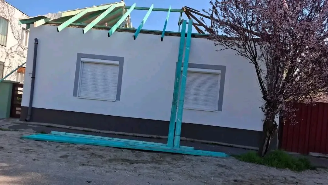 m² tatai cseréppel rakott tető szigetelése és cserepes lemezre cserelese, plusz ket db tetoablak beepitese. Szarufak jo allapotuak.