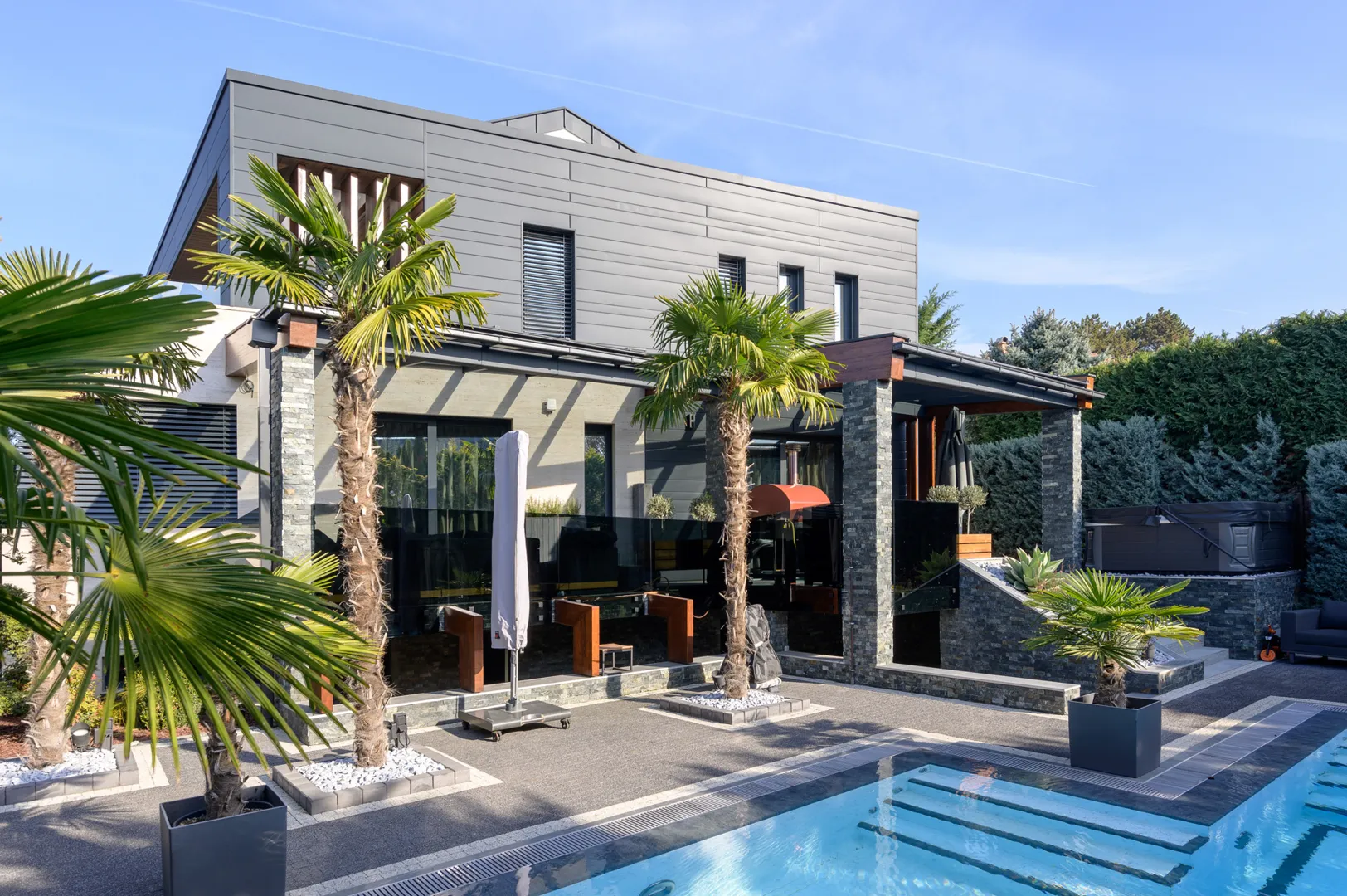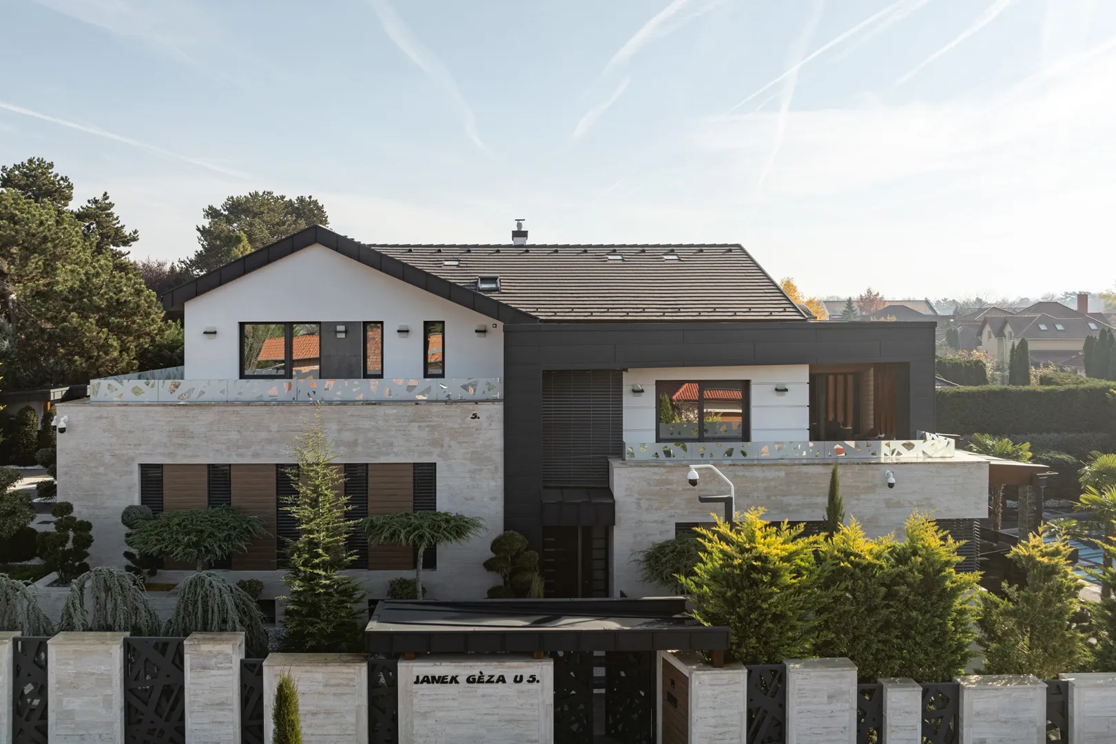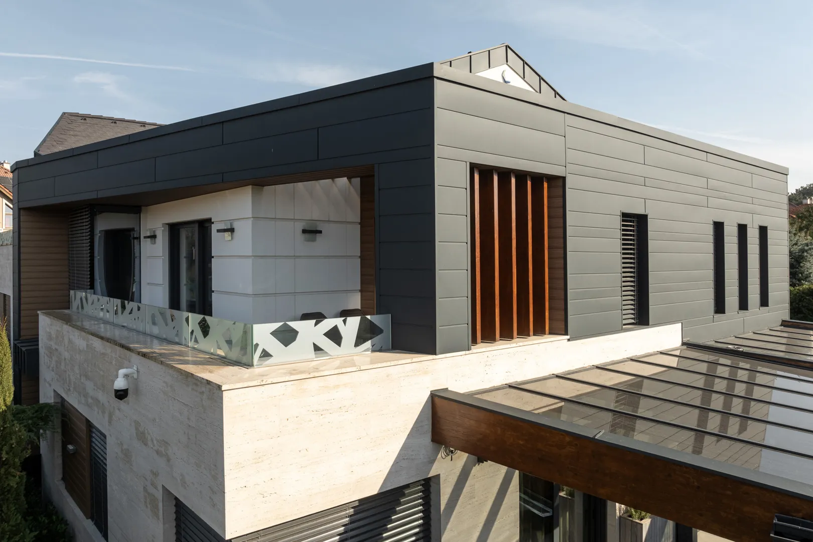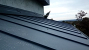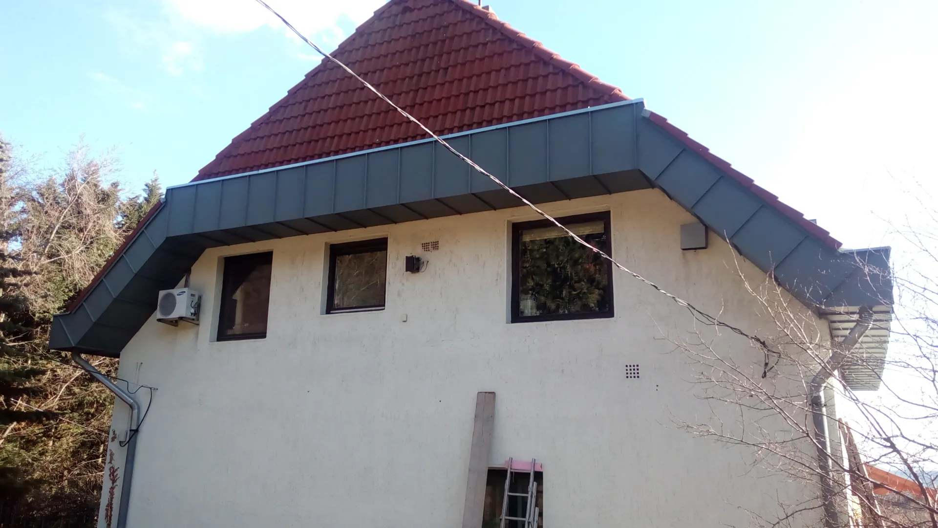 Kerámia cserép csere cserepes lemezre m2 nyeregtető. 33m csatorna 4db lefolyóval, 1db kémény szegély, szél deszka lemezelés. A lécezés 2 éves, 35 cm távra.