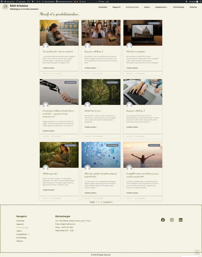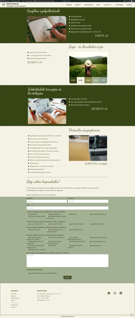 Rólunk: Róth Krisztina vagyok, és szenvedéllyel támogatom a szolgáltatásalapú vállalkozókat és egészségügyi szakembereket a sikerük elérésében. Nem csupán egy szolgáltatást kínálok, hanem egy hosszú távú partneri kapcsolatot, amely a te céljaidat és küldetésedet tükrözi. A célom, hogy olyan digitális megoldásokat biztosítsak, amelyek nemcsak a vállalkozásod növekedését segítik, hanem egy egységes, átgondolt stratégia részeként biztosítják a fenntartható sikert.