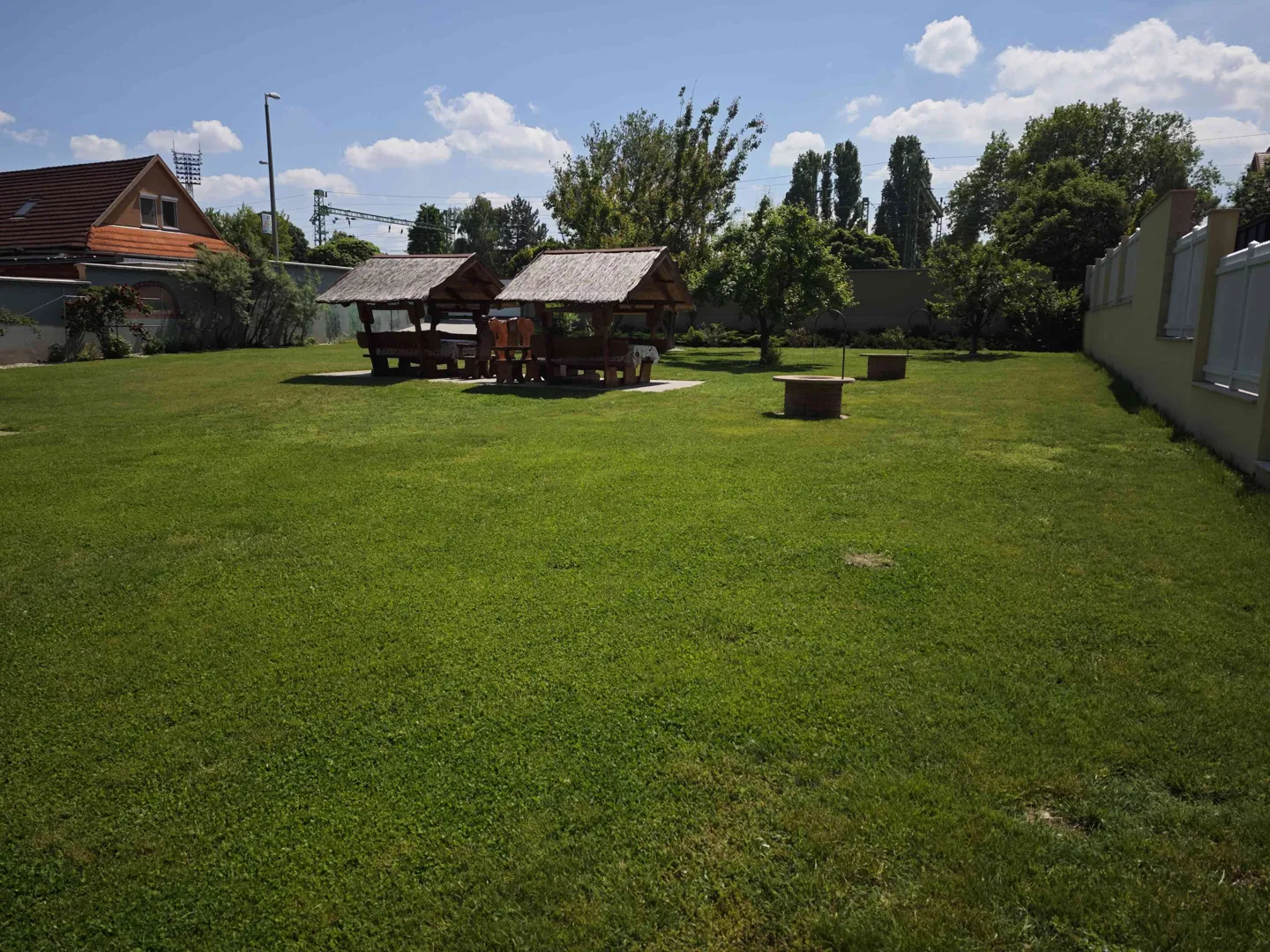 A telek, amelyen m2 +dupla garázs van négyszögöl, tavaly évig tökéletesen rendbe tartott kert volt minimális konyha kert (eper, málna, ribizli, csemege szőlő) résszel. Jelenleg próbáljuk rendbe tartani, de nem megy. Szükség van permetezésre, metszésre, kevés kapálásra. Hátsó rész kútból kap locsoló vizet, a hát előtt, automata rendszer locsolja a füvet. Leylandi ciprus bókrok 3 m magasak védik a belátást a szomszéd hát felől