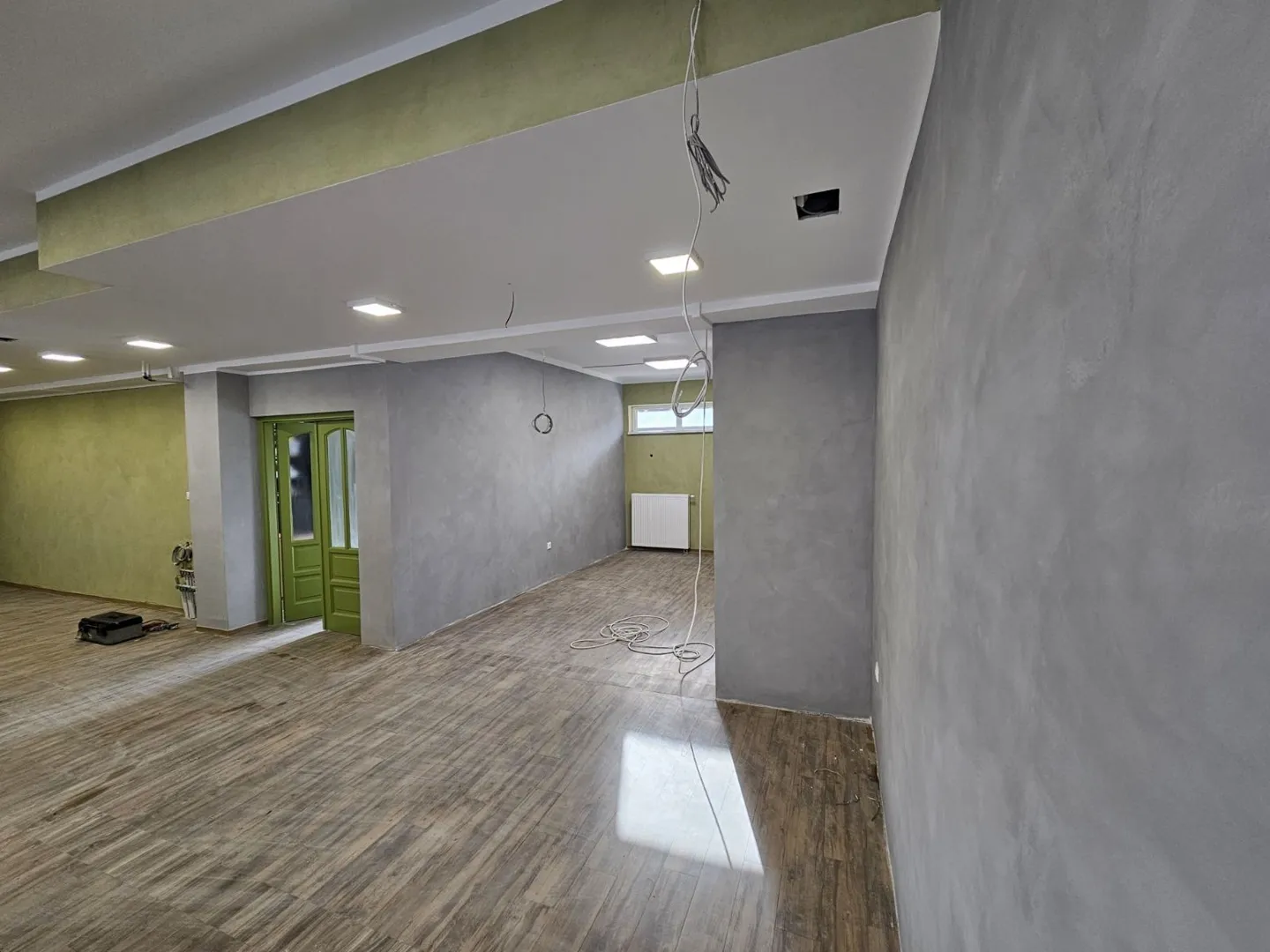 Sima fehér festés kisebb glettelesekkel, javításokkal és de kornak néhány helyen tapéta. Cukrászdának készül az uzlethelyseg.